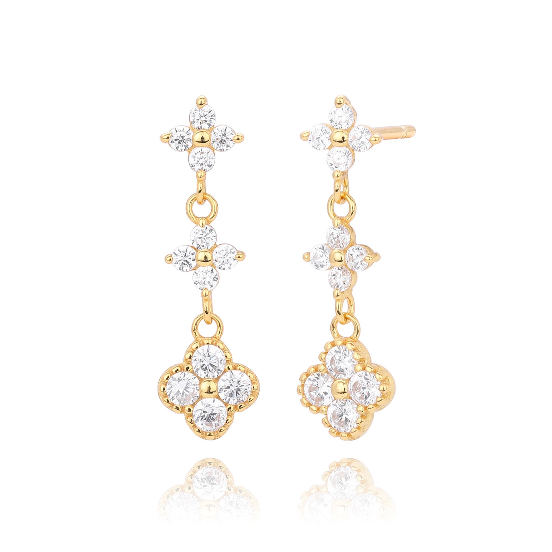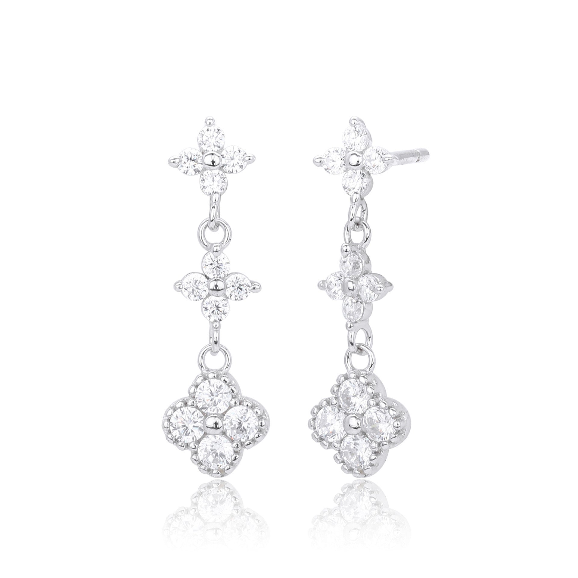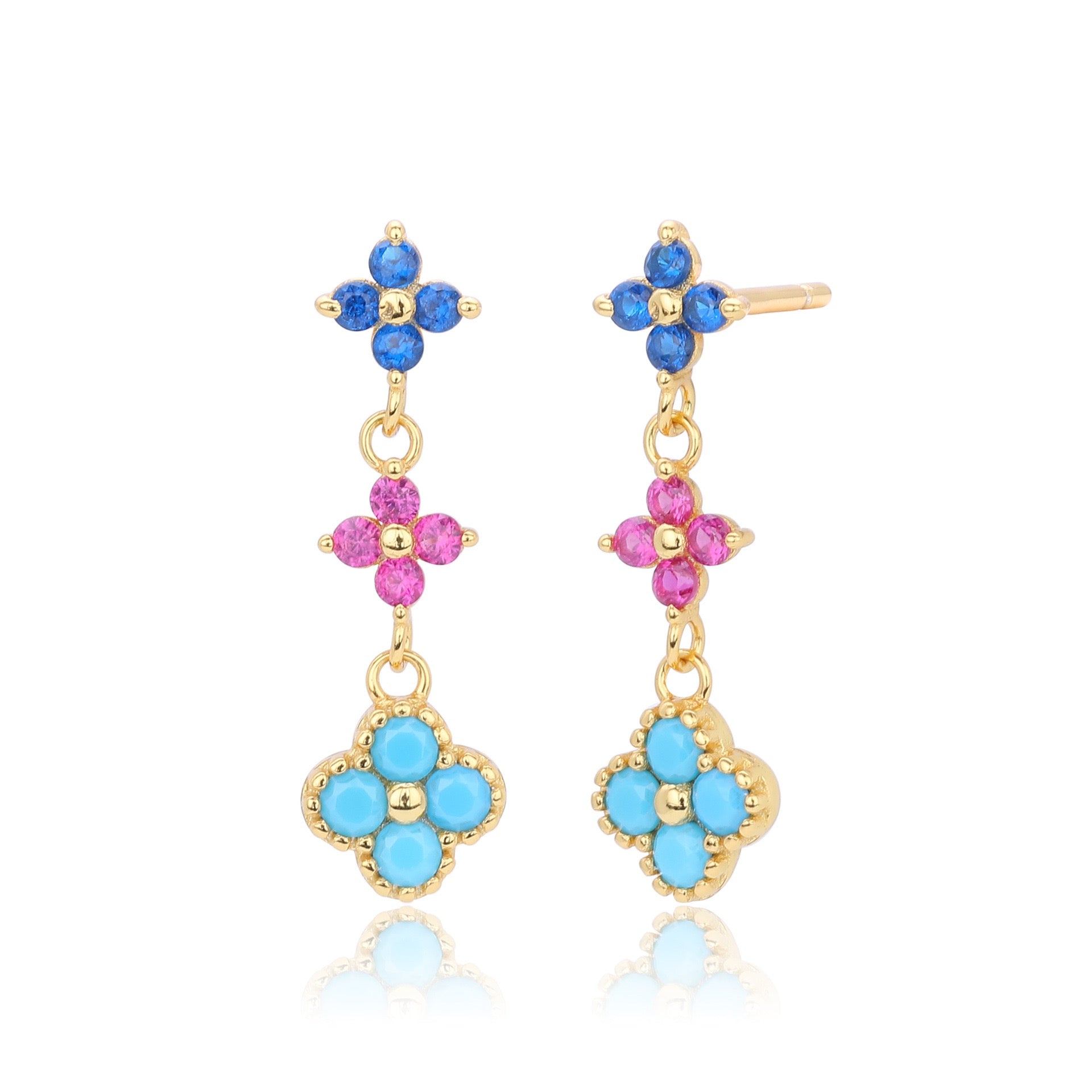 3 little flowers dangling earrings in white or multi color zirconia